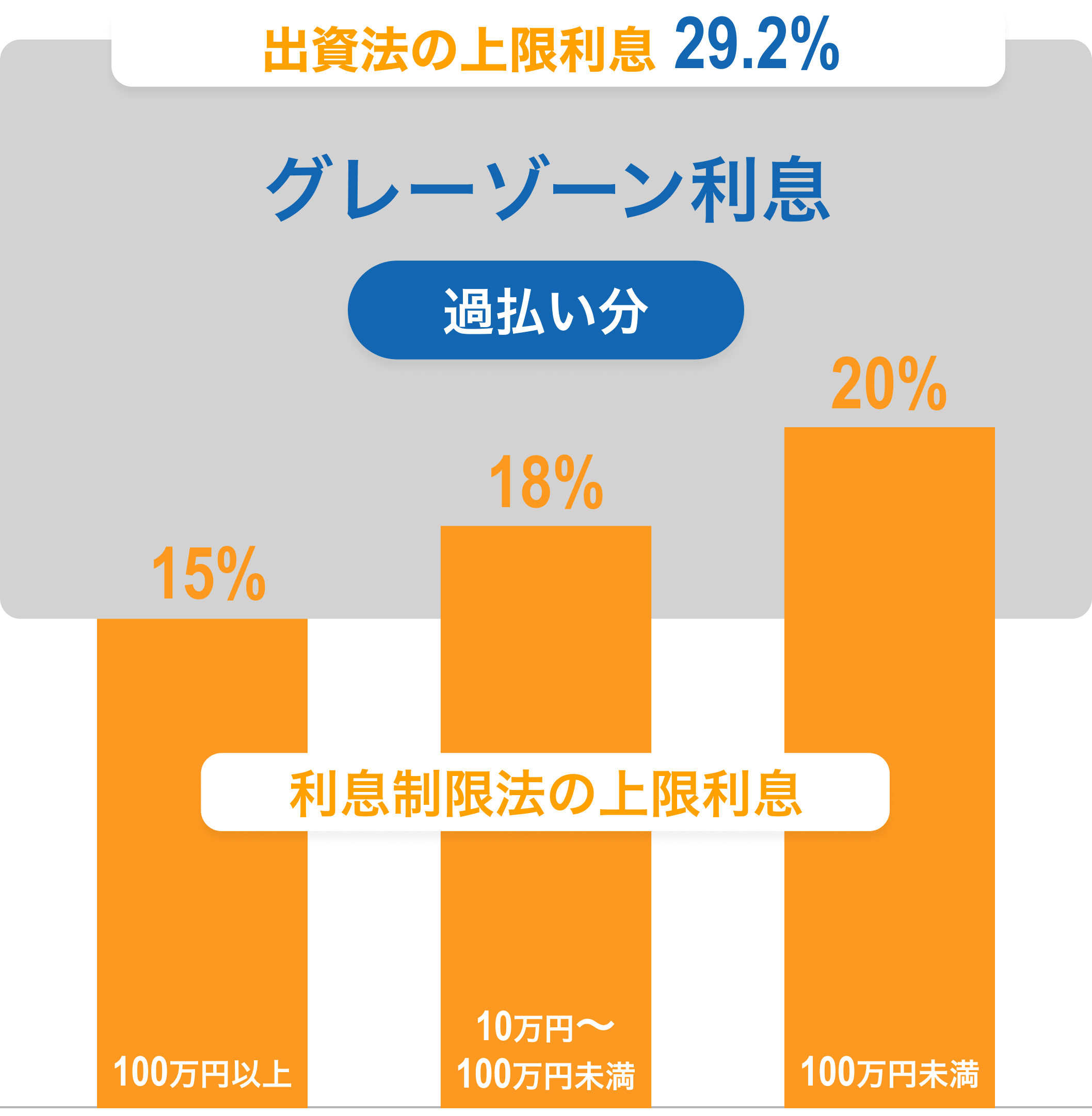 この出資法と利息制限法の間の上限利率をグレーゾーン金利と言い、払い過ぎた利息となります。